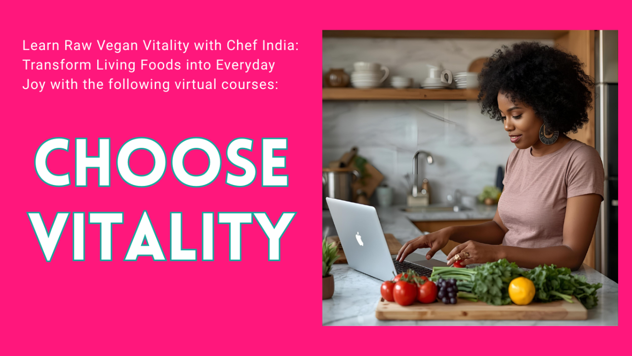 This isn’t just another course—it’s a transformational experience. Inside, you’ll learn Chef India’s extraordinarily delicious recipes and proven techniques that make raw vegan living feel natural, joyful, and deeply satisfying. By the end, you won’t just know the how—you’ll embody the why, equipped to lead, teach, or simply thrive in your own vibrant lifestyle.