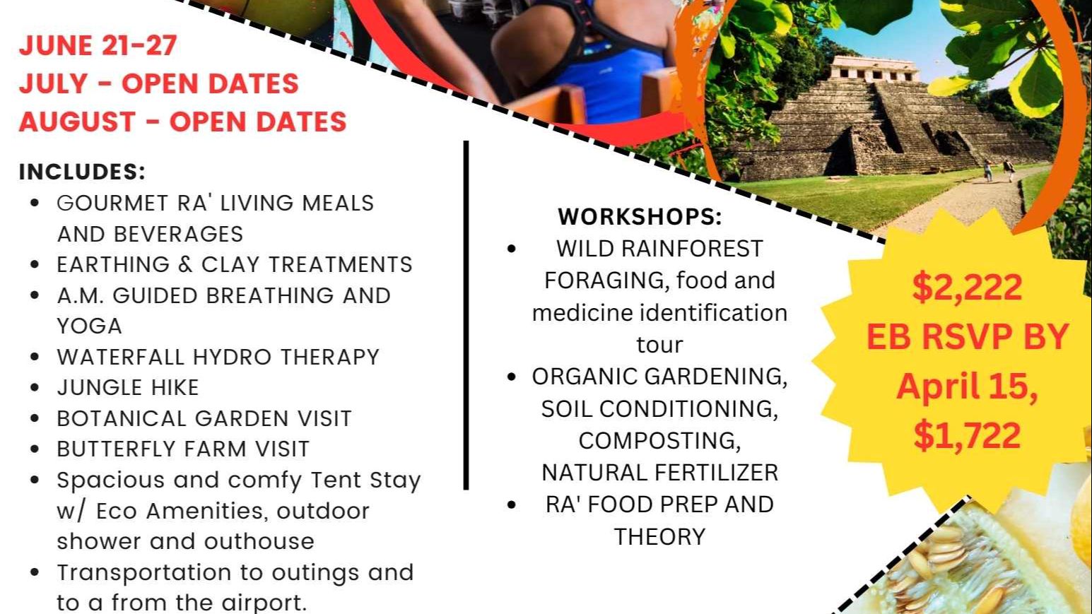 Back 2 Netur Retreat by Back2live is a boutique, eco, camping retreat experience where you'll have the opportunity to rejuvenate with gourmet 5-star RA' cuisine especially made for you, enjoy RA' food workshops with chef, tour beautiful Belize and trek through the jungle to a secret waterfall spot. RESET IN NATURE, IN THE BELIZE RAINFOREST TO BE EXACT. Or take the time to join Chef India and her partner Judah in some land works. The camping tents are spacious with 360-degree views.